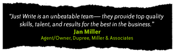 manuscript, workbook, audiotape, or marketing material, you want impeccable communication. Your words matter. Thats why savvy authors, agents, speakers, executives, and marketers rely on us at Just Write for top-notch support in creating excellence in both the written and spoken word.